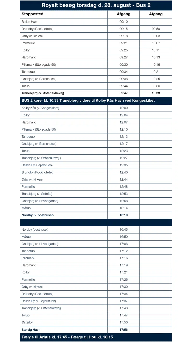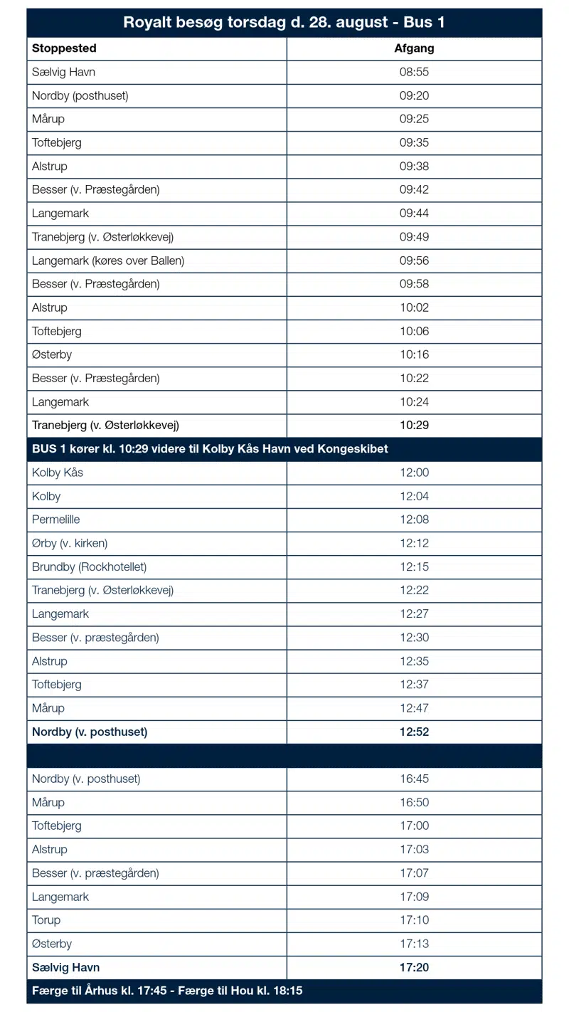 I anledning af Kongeparrets besøg indsættes der busser, hvor køreplanen primært tilpasses Lilleøres sejlplan og programmet for D.M. Kongen og Dronningen. Derudover tilbydes der gratis buskørsel på dagen.
